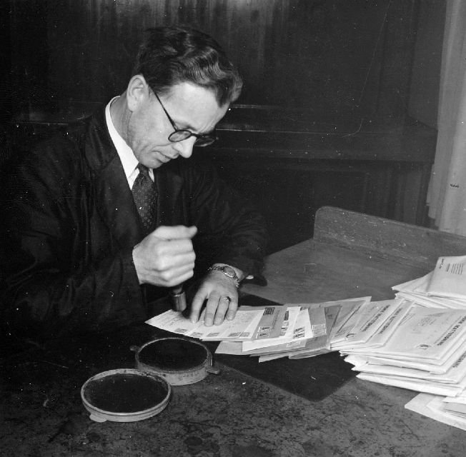Handstämpling av brev på postkontoret Stockholm 2. Foton 2/4