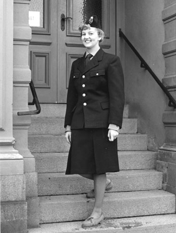 Vinteruniform för kvinnlig postiljon. Foton 4/2 1960. Modell är Maud Bergström, bankavdelningen. Hel uniform. Med lågklackade skor.