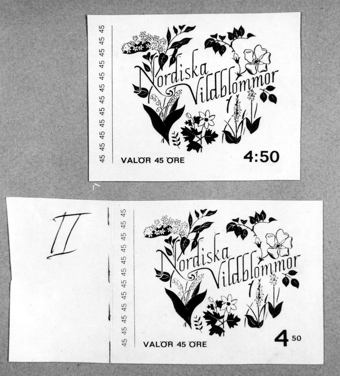 Två ej antagna häftesomslag till frimärksutgåvan "Nordiska Vildblommor" 1968 utförda av Lars Norstedt.