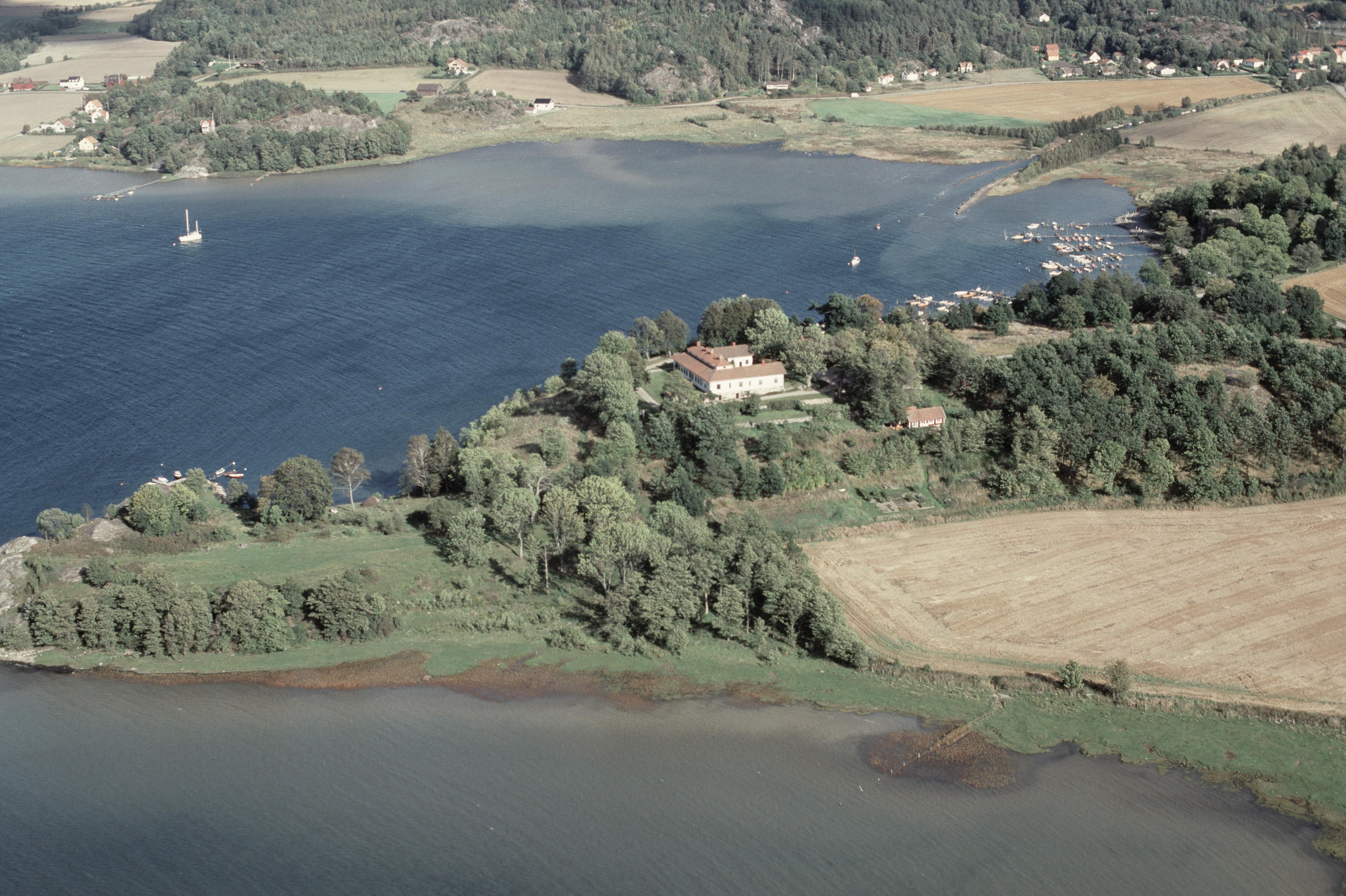 Gullmarsbergs herrgård / säteri. I bildens övre del Dyngö ruin (Dyngehus borg) RAÄnr Skredsvik 146:1 och 254:1 vid Gullmarsvik i sjön Gullmarn. Bilden är tagen mot (väderstreck): ONO
