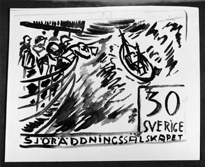 Skisser till frimärket Sjöräddningssällskapet 50 år, utgivet 1/6 1957. Svenska Sällskapet för Räddning af skeppsbrutna bildades den 1/6 1907. Konstnär: Torsten Billman. Skiss "30" "Sverige". Valör 30 öre.