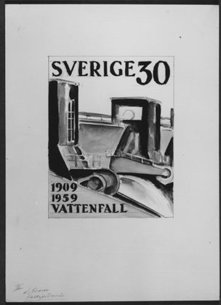 Förslagsritningar till frimärket "Vattenfallsverket 50 år", utgivet 20/1 1959. Konstnär: Lennart Gram. Foton 30/5 1967.