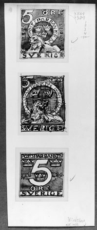 Ej realiserade förslag till frimärken Postsparbankens 50-årsjubileum, utgivet 6/12 1934. Kartong med tre förslag.
