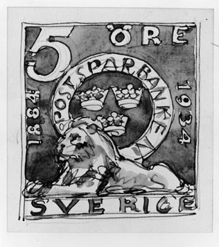 Ej realiserade förslag till frimärken Postsparbankens 50-årsjubileum, utgivet 6/12 1934. Konstnär: Olle Hjortzberg.