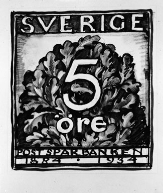 Ej realiserade förslag till frimärken Postsparbankens 50-årsjubileum, utgivet 6/12 1934. Konstnär: Olle Hjortzberg.