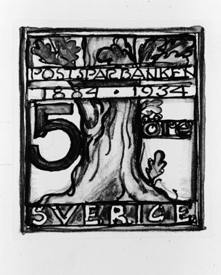 Ej realiserade förslag till frimärken Postsparbankens 50-årsjubileum, utgivet 6/12 1934. Konstnär: Olle Hjortzberg.
