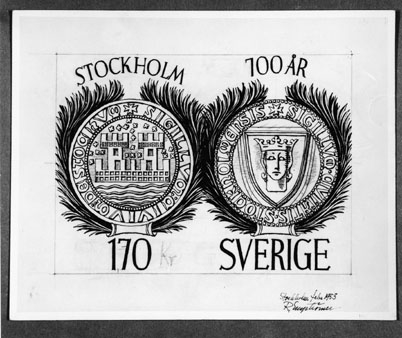 Ej realiserade förslag till frimärket Stockholm 700 år, utgivet 17/6 1953. Konstnär: R Engströmer. Valör 1:70 kr.
