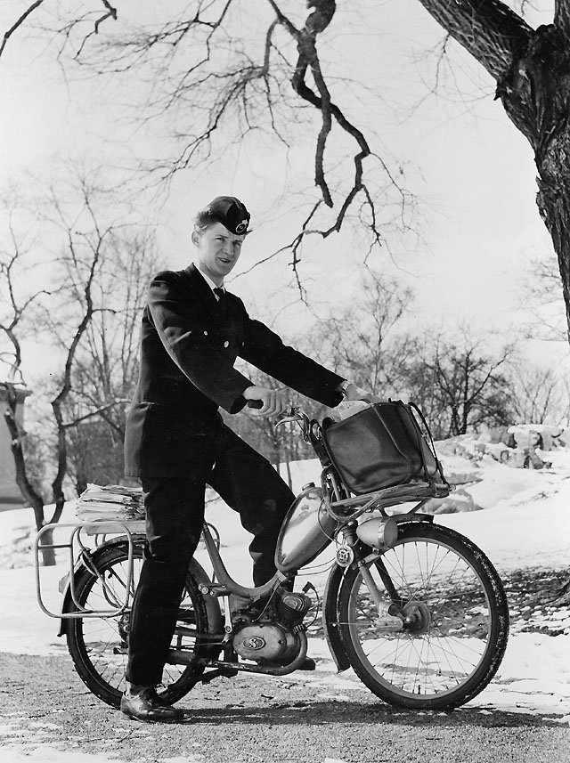 Brevbäraraspirant Assar Widegren på en postmoped med Sachsmotor.