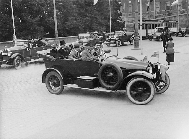 Bilkortègen. I första bilens baksäte generaldirektör Juhlin i