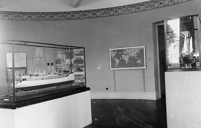 Från vänster: modell av ångfärja, Verldskarta (blå) och modell av