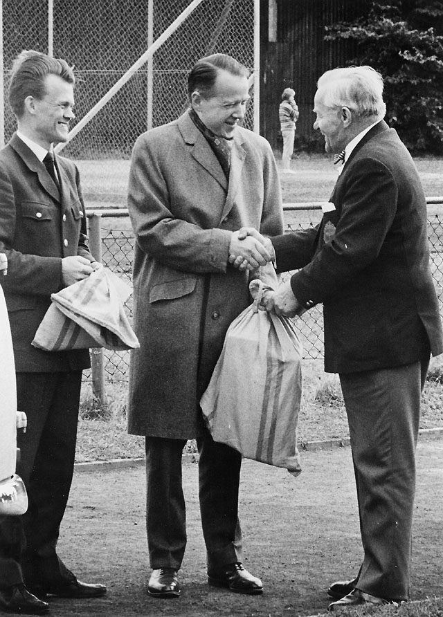 Kapten Ahrenberg, t.h., överlämnar posten, 2000 specialstämplade brev, som signerats av honom, till Sollentunas postmästare Gösta Nygren. T.v. postiljon Gunnar Svenerdahl.