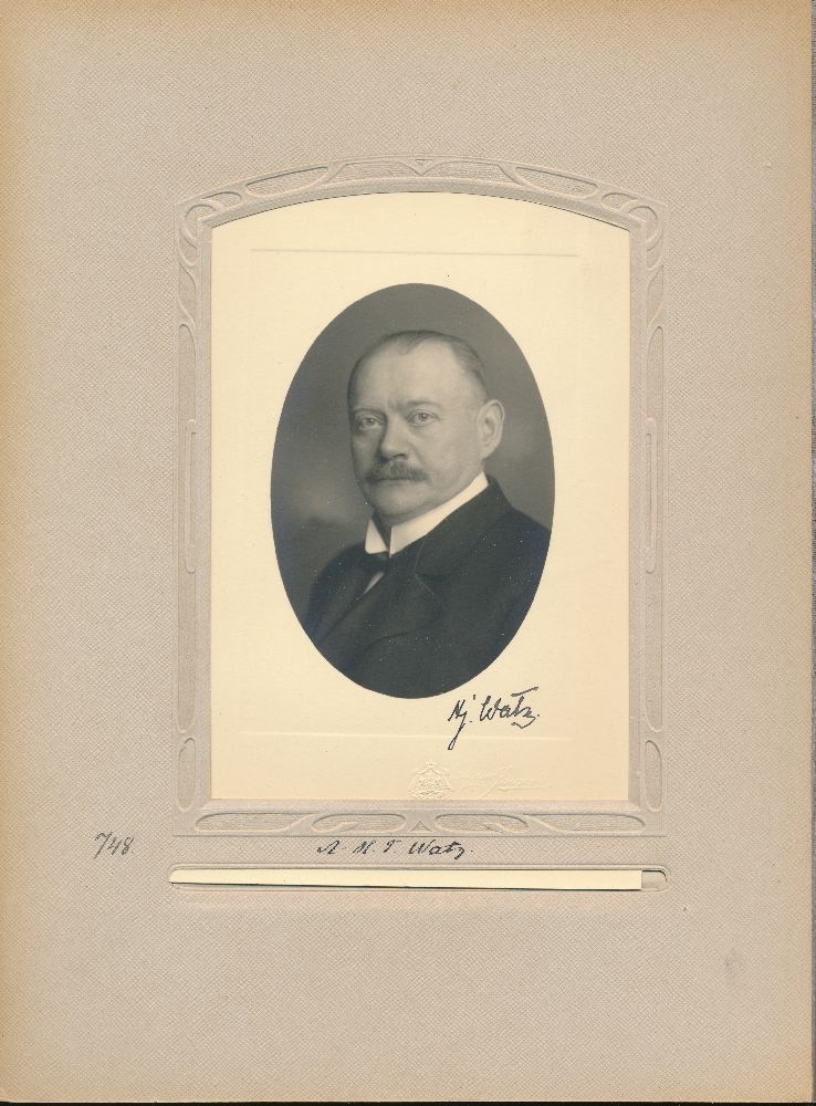 Porträtt av Albert Hjalmar Theodor Watz, förste postexpeditör vid avdelningen för avgående poster vid Stockholm 2 från 1909.