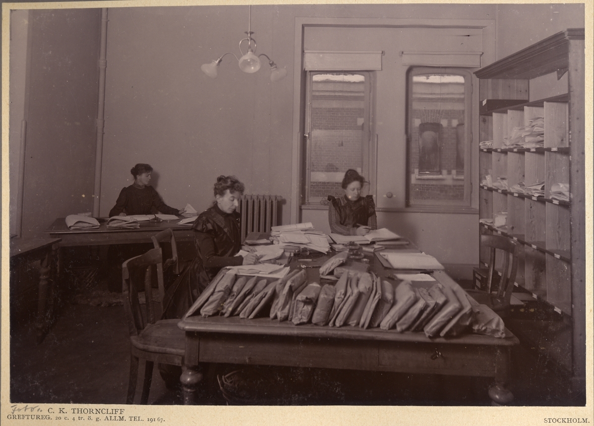 Postsparbanken, Centralposthuset, Stockholm, år 1903. Ella Södergren, Sigrid Bergman och Ellen Lönegren.