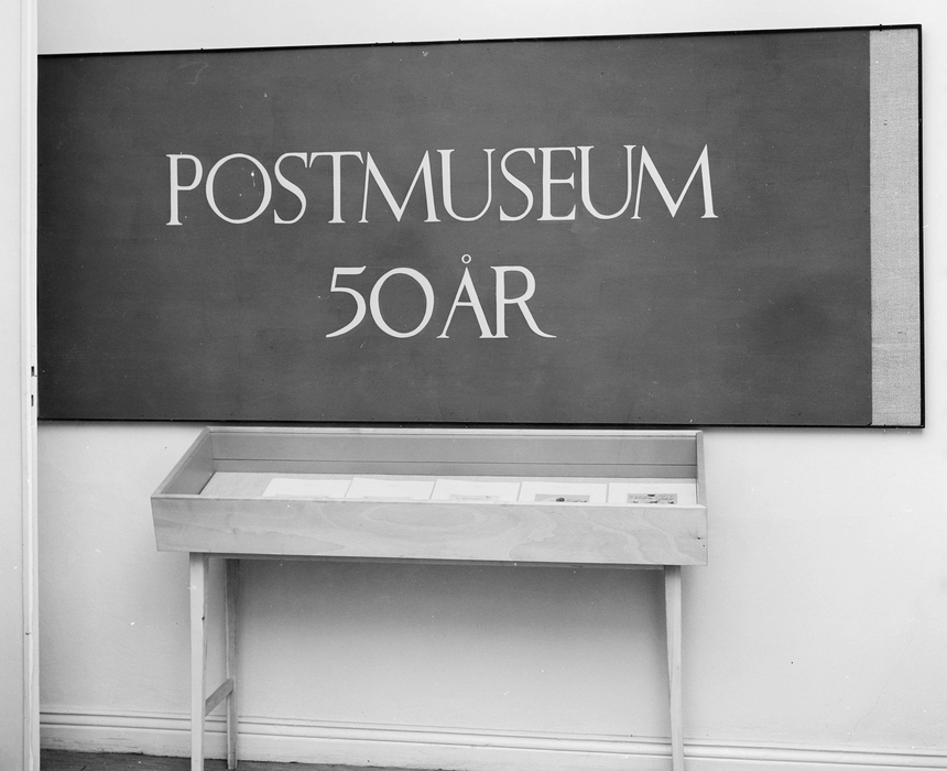 Monter med några blad ur Postmusei Vänners jubileumsgåva till