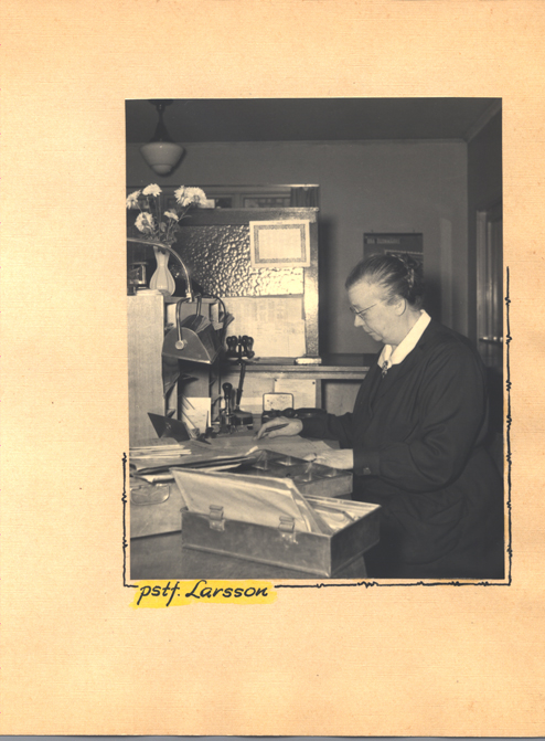 Poststationsföreståndare Larsson vid kassaplatsen i Bromsten.