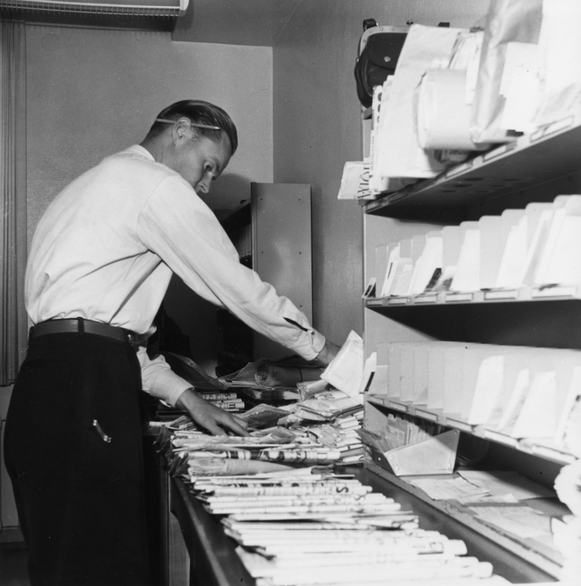 Lantbrevbärare Knut Svensson, Växjö, sorterar dagens post, 1953.