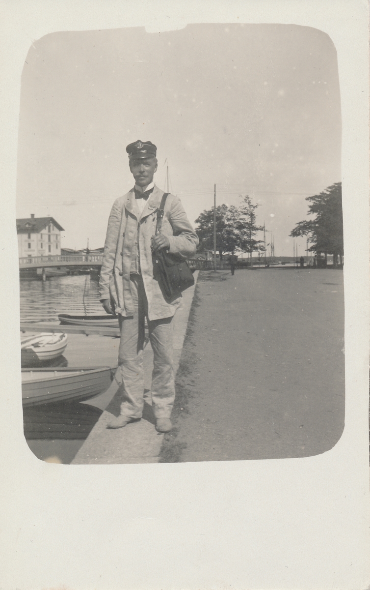Vykort med motiv av brevbäraren Ernst W Ekberg i hamnen i Norrtälje.