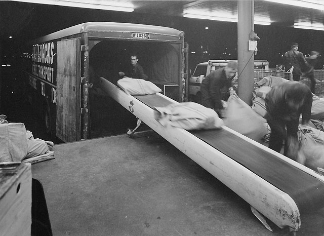 Lastningen sker med hjälp av ett portabelt transportband. Bussen