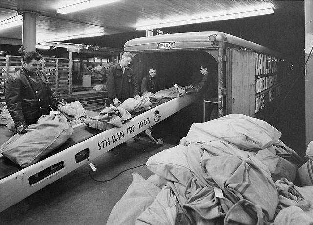 Lastningen sker med hjälp av ett portabelt transportband. Bussen