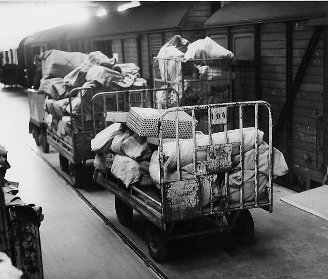 Titel: Det iordninggjorda paketet på väg att lastas i godsfinka vid Stockholm Ban.