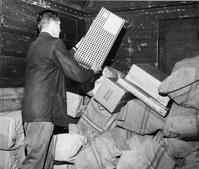 Titel: Paketet stuvas bland övriga lösgående paket i godsfinka.