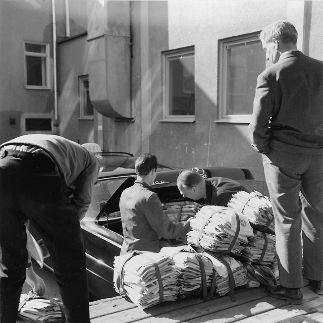 Exteriör från Solna 1. Ilastning av buntar i taxibil.