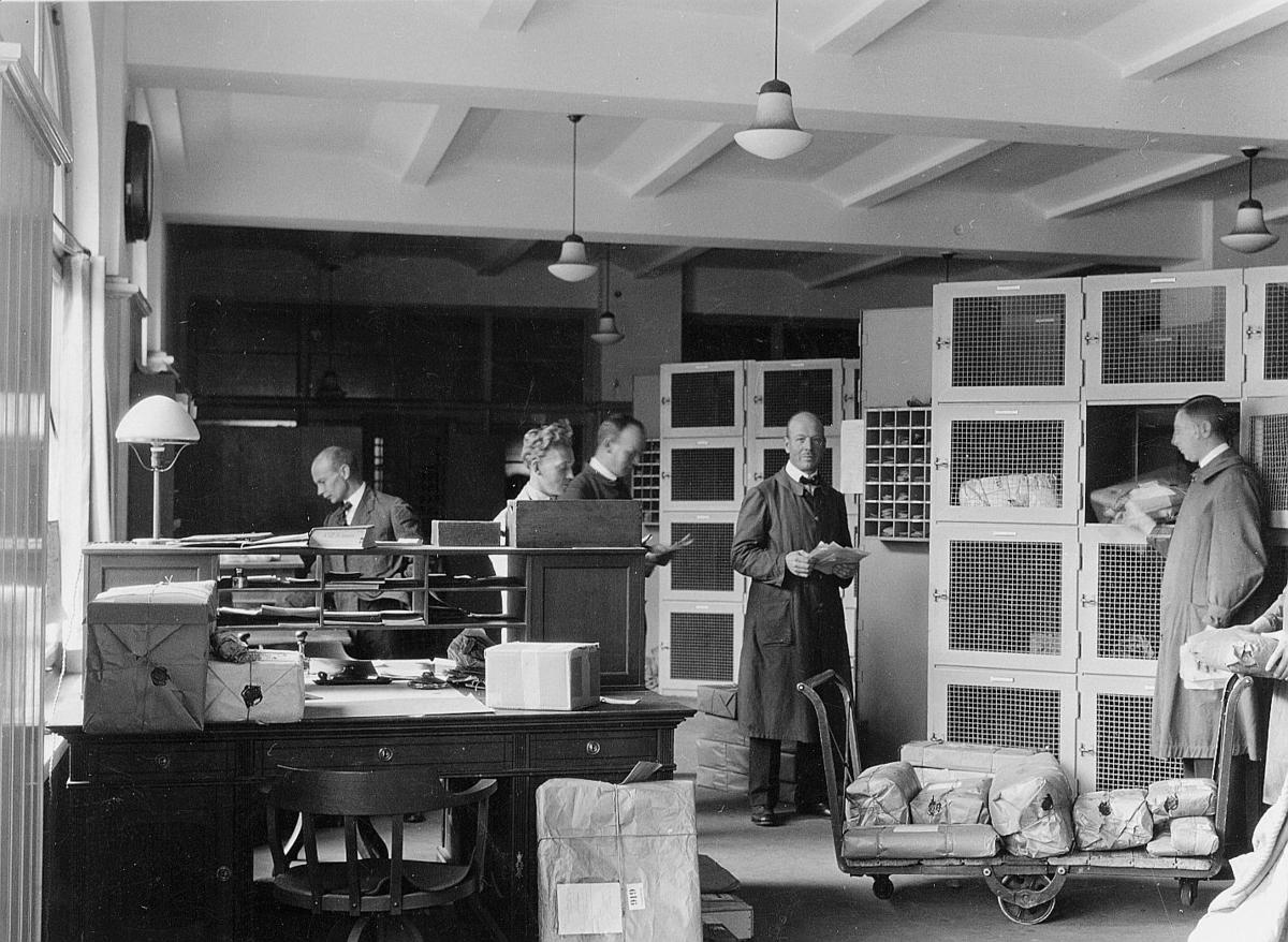 omkring 1925. Utrikes paketexpedition i undre bottenvåningen, mot