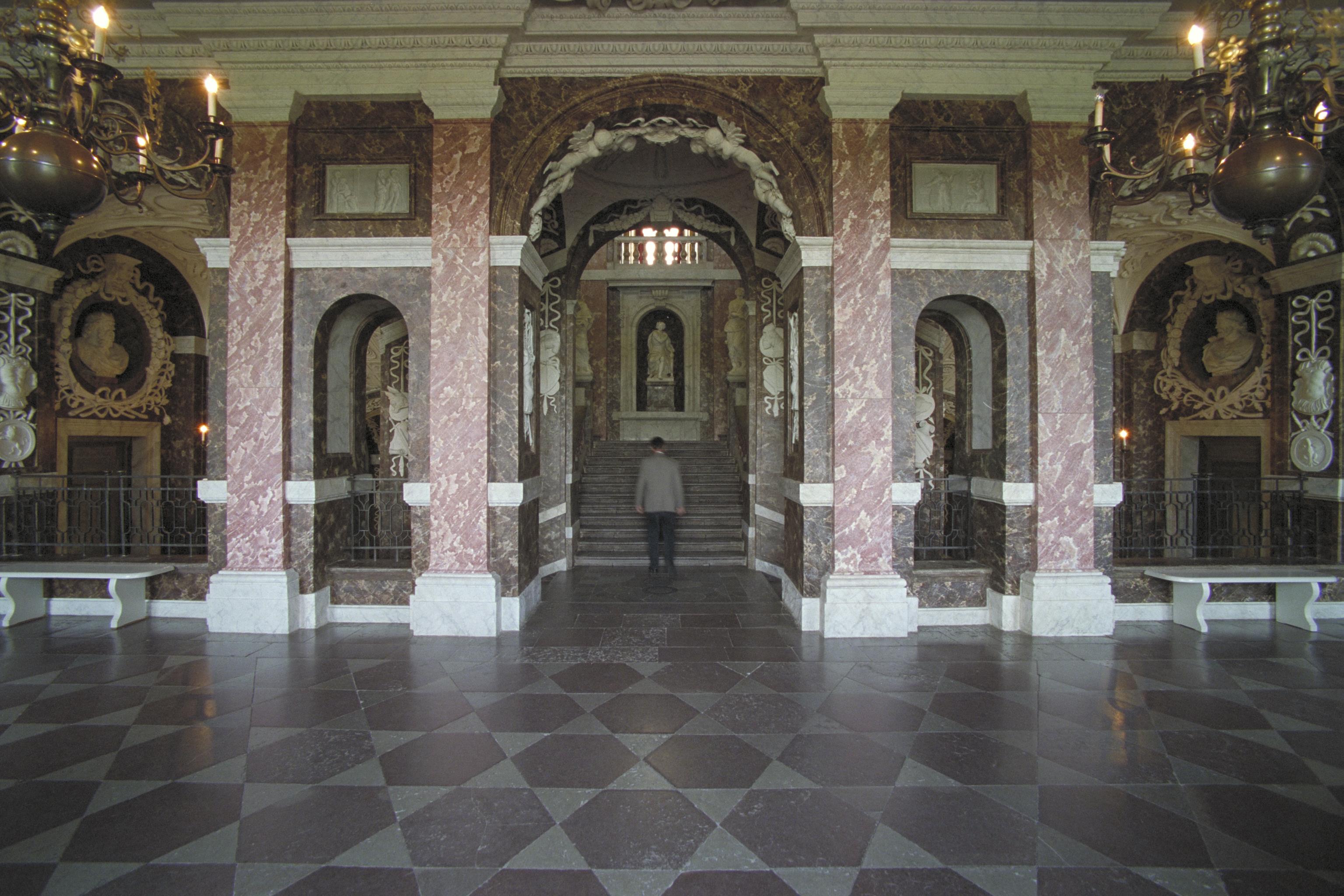 Slottets trapphus, änglastuckatur över portal på huvudvåningen.