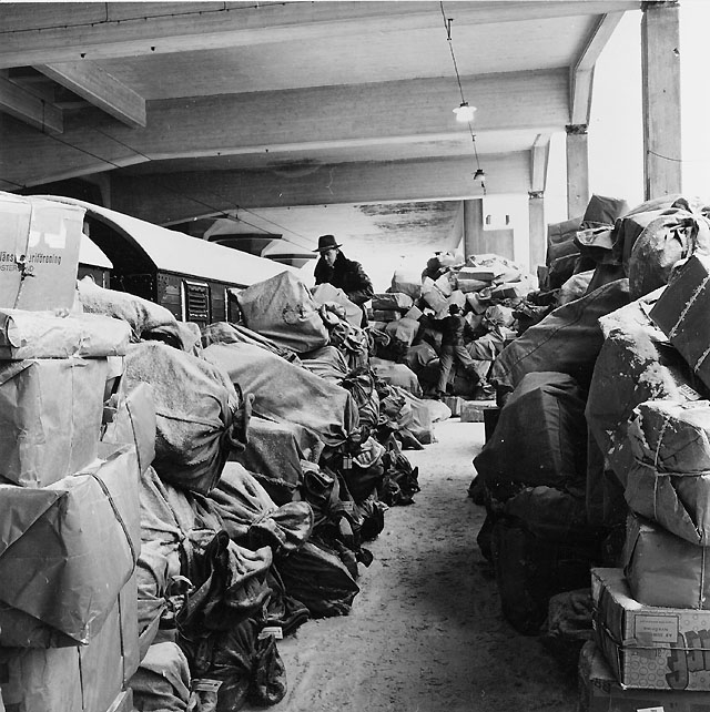 Transiterade postpaket lagras, i väntan på tåglägenhet, utanför