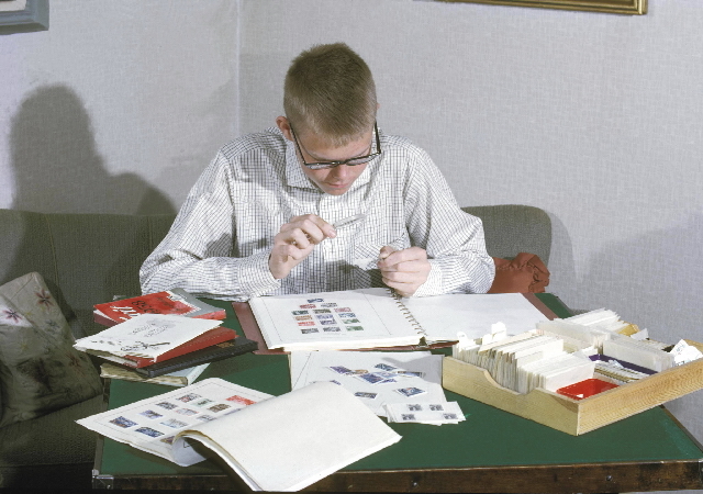 Seriebild M 14. Ung frimärkssamlare studerar frimärken med