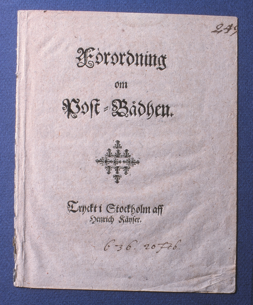 Seriebild M 22. Omslaget till "Förordning om Post-Bådhen" tryckt i
