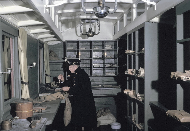 Seriebild M 25. Interiör av järnvägspostkupén från 1870-talet, som