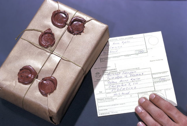 förseglade med rött lack. På adresskortet anges att paketet, som