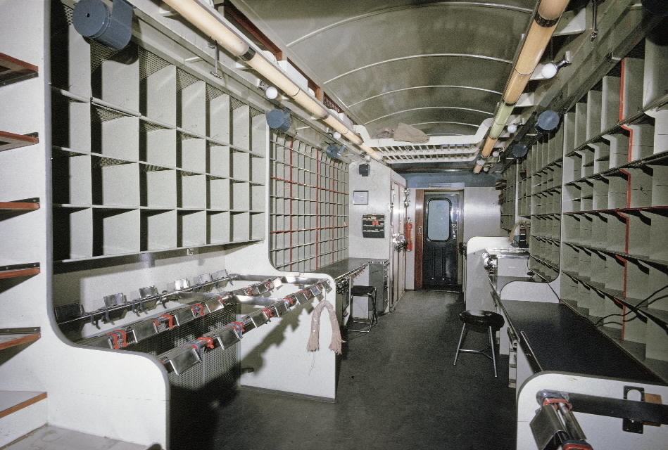 Interiör av ny modell av järnvägspostvagn, uppställd vid postkontoret Stockholm Ban, den 7 november 1963.