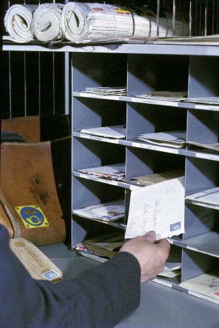 fram till post-kontoret Solna 1. Brevbäraren sorterar in brevet i ett