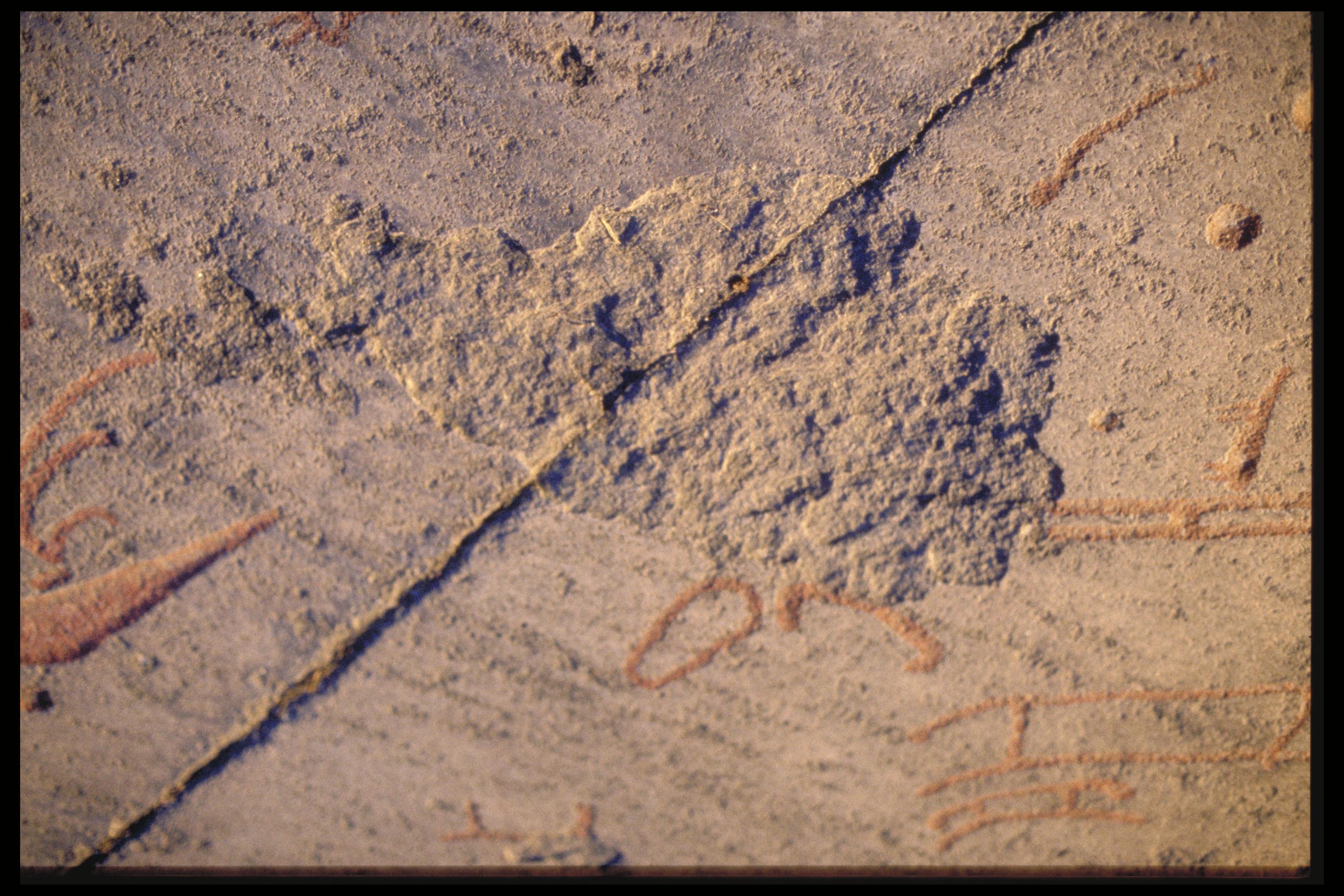 Vittringsskada på hällristning. Tanum 75:1.