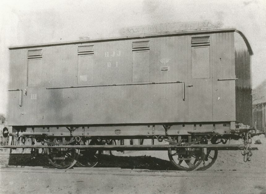 Fotografi föreställande postvagn Litt D nr 1 på linjen Halmstad-Jönköping, ca 1877.