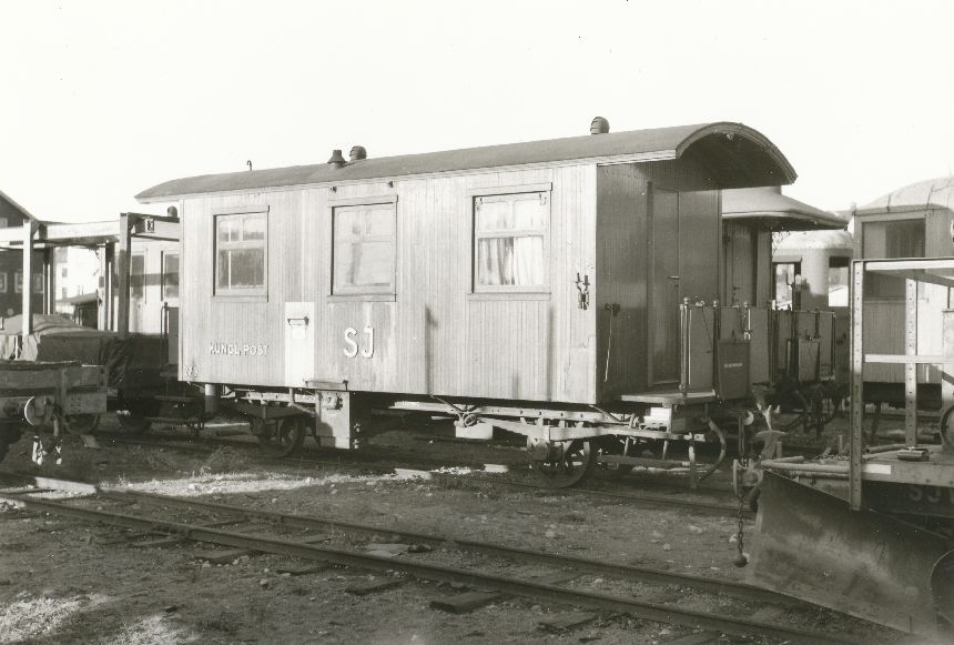 Fotografi föreställande Järnvägspostvagnen SJ litt CD9p 279, t.d Kalmar-Torsås järnväg C 1332. Fotot är taget i Växjö 1953.