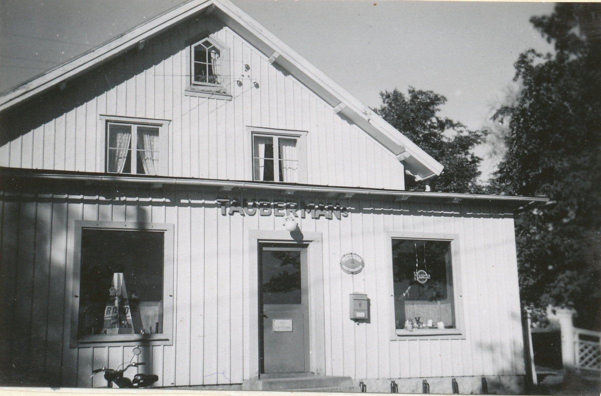 Exteriör av poststationen i Hackvad, inrymd i en butik, 1954.