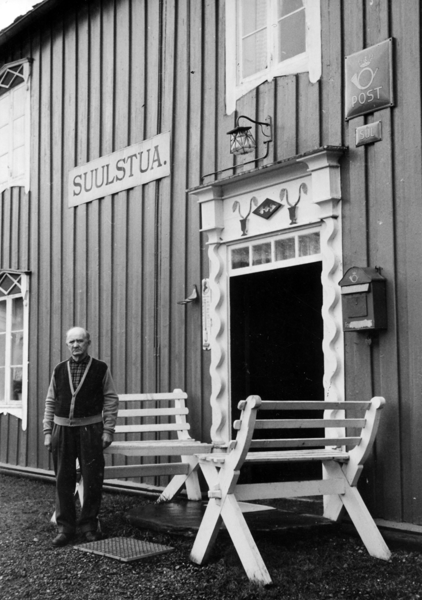 Posten i Sul, Norge, mars 1963. Framför huvudbyggnaden på gården Sul, står poståpnern Martin Suul, 77 år. Gården har varit skjutsstation och gästgiveri i många generationer.