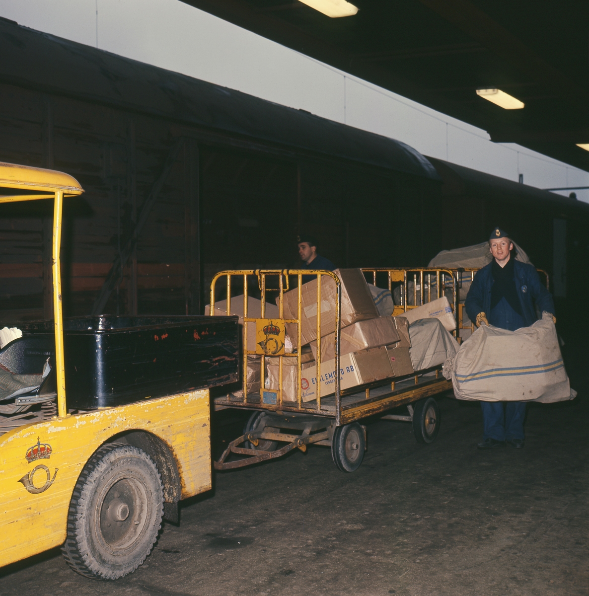 Lastning och lossning av post vid järnväg. Perrongtruck med släpvagn vid järnvägsvagn, 1960-talet.