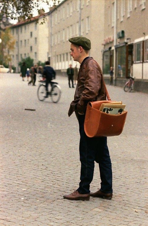 Titel: Civilklädd brevbärare med brevbärarväska.