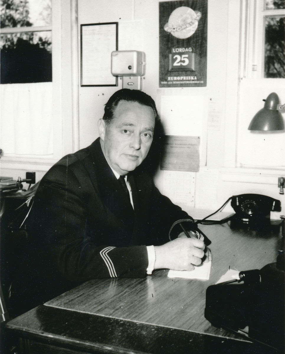 Fotografi med motiv Edvard Wallnäs, den siste stationsmästaren i början av 1950-talet. Fotografiet visar även interiören av postkontoret till viss del.