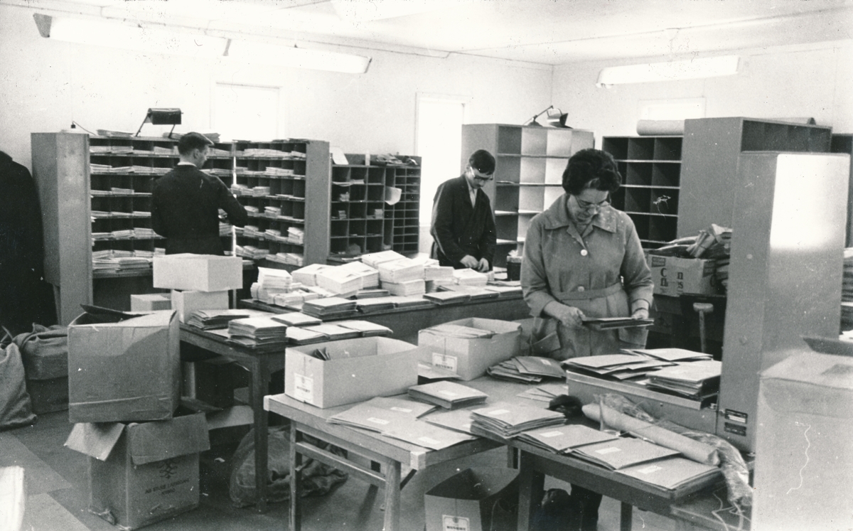 Interiörsbild av "Baracken" som användes som masspostlokal under 1960-talet samt som brevbäringsexpedition under Postkontorets ombyggnad.