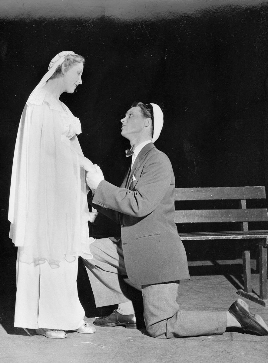 I pjäsen "Han, hon och månen". av Nils Beyer, står Rune Boring på knä framför Ingrid Larsson.