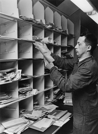 Pkp 310. Kurt Hansson sorterar långsmala brev och korsband.