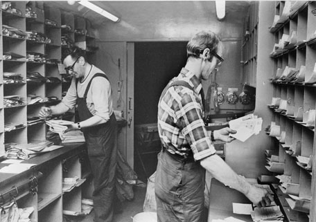 Överpostiljonerna Evald Widén t h, och Erik Lundh spridningssorterar