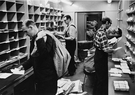 I en vagn försiggår spridningssortering på Alvesta brevområde. Det