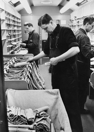 Pkp 94. Nils Dahlström, närmast, har tömt säcken med korsband i