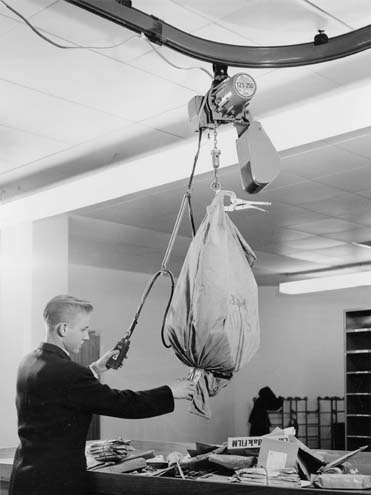 Postiljon Gösta Karlsson i brevbärarexpeditionen vid postkontoret Solna 1. Transportanordningen av märket Telfer, Stahl Elektrus RE 4-24 underlättar upplyftning och tömning av postpåsar på resningsbordet.
